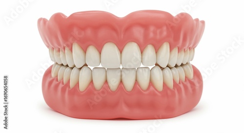 © Ahmed, Obraz premium A set of dentures with white teeth and pink gums displayed on a plain white background in a studio shot