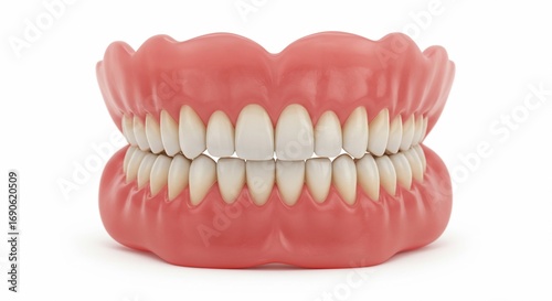 © Ahmed, Obraz premium A set of dentures with white teeth and pink gums displayed on a plain white background in studio shot