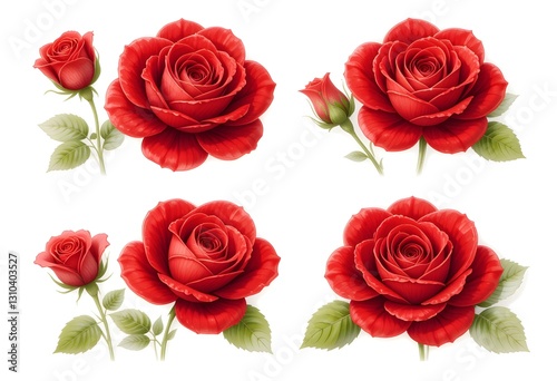 © Adeteye Adeniyi, Fototapeta premium A set of different red roses, children's book illustration style, on a white background.