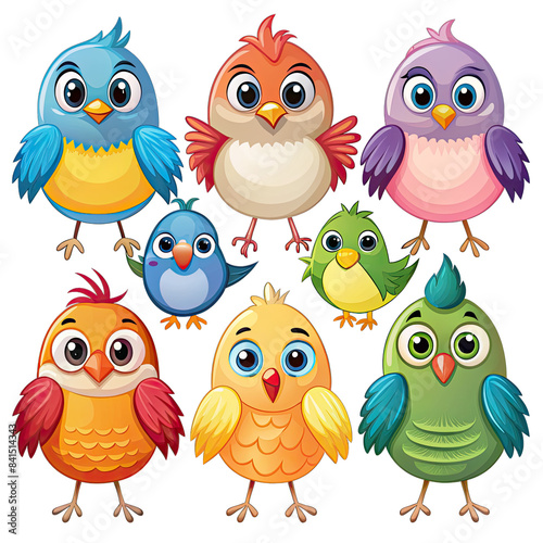© Jahan Mirovi, Fototapeta premium A set of eight cartoon birds, each with unique colors and designs, are isolated on a white background. They are all facing the viewer with their beaks open, as if they are about to sing. Generative AI