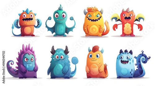 Naklejka premium A set of eight colorful cartoon monsters with different expressions. They...