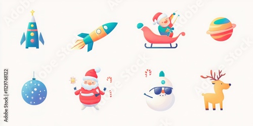 Naklejka premium A set of festive, cartoonish Christmas and space-themed icons.