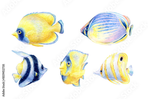 © Elena, Fototapeta premium A set of five hand-drawn watercolor illustrations of vibrant tropical fish swimming in yellow and blue tones with graceful fins. Perfect for aquatic-themed designs, prints, and greeting cards.