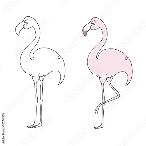 © Marina Baeva, Fototapeta premium A set of flamingos. Silhouette of a flamingo in a continuous line. Tropical bird drawn by one line. Vector illustration for logo.