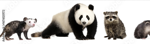 Naklejka premium A set of four animals an opossum on the left a panda standing in the center a raccoon sitting down to the right and a quokka on the far right side all agains