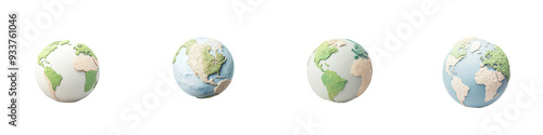 Naklejka premium A set of four Earth globes displaying different regions on transparent background, ideal for geography, environmental, and educational themes.