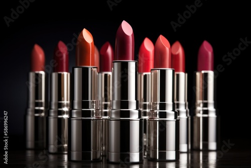 Fototapeta premium A set of lipstick on a dark background. Red, pink, wine, wine lipstick. generative AI