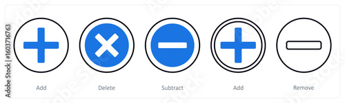 Obraz premium A set of 5 mix icons as add, delete, subtract