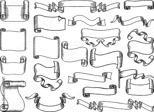 © Christos Georghiou, Fototapeta premium A set of paper scrolls, banners, ribbons and flags design elements in an engraved or etched hand line drawn style.