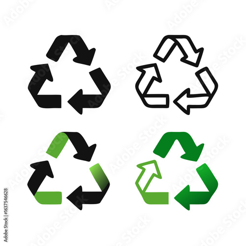 Fototapeta premium A set of recycling symbols in various styles, including solid green, outlined black, and gradient green, showcasing eco-friendly concepts in a clean vector format