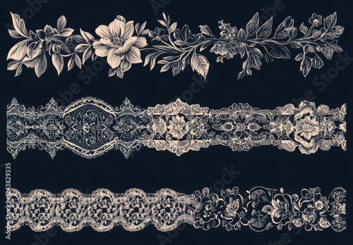 © Yzid ART, Fototapeta premium A set of seven dark-colored lace borders with different pattern styles