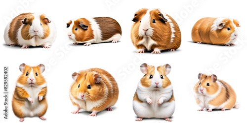 Fototapeta premium A set of six different guinea pigs and hamsters in various poses, PNG with...