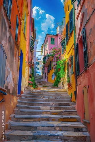 © Brian, Fototapeta premium A set of stairs leading up between colorful buildings in a barrio residential neighborhood