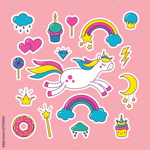 Naklejka premium A set of stickers with a cute pony, candies, cupcakes and a rainbow with clouds.