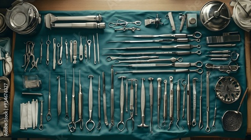 Fototapeta premium A set of surgical instruments including scalpels forceps clamps tweezers and scissors neatly arranged on a sterile medical table ready for a surgical procedure