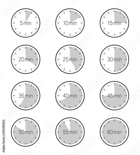 Naklejka premium A set of timer icons. Countdown symbols collection from 5 to 60 minutes. Design templates isolated on white background. Vector illustration