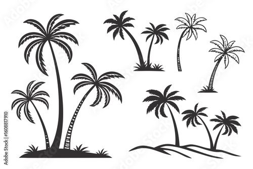 Fototapeta premium A set of tropical palm tree vector illustrations for beach and vacation themes, isolated on white background