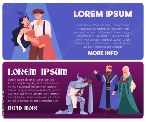 Obraz premium A set of two banners for invitations to a performance with theater characters.