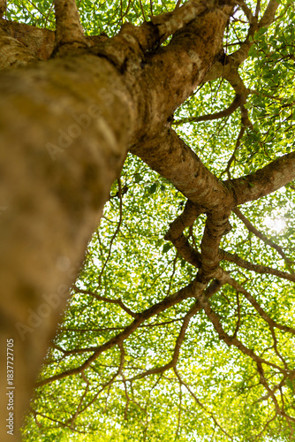 © Redd Molecule, Naklejka premium A set of upward-view photos capturing tree bark textures, tall trunks, and vibrant green leaves creating a lush canopy in a calm public park. Perfect for nature and background uses.