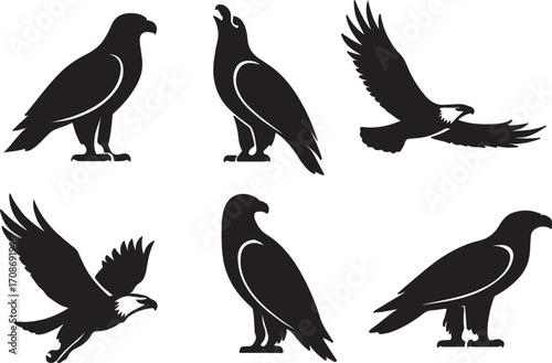 © MadDock, Fototapeta premium A set of vector silhouette illustrations of the Bald eagle flying wild birds