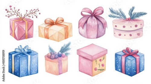 © Rauf, Obraz premium A set of watercolor gift boxes, each with a unique design.