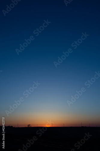 © Stone's Throwe Photo, Fototapeta premium A setting sun dips below the horizon in an almost cloudless blue sky.