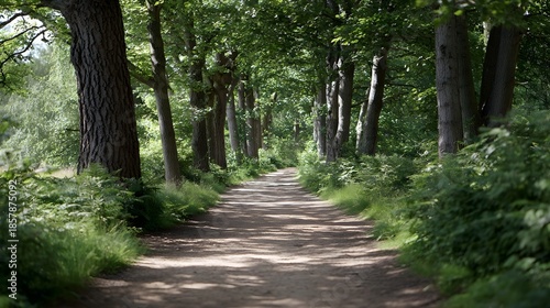 © Bussakon, Fototapeta premium A shaded forest path lined with lush green trees and foliage