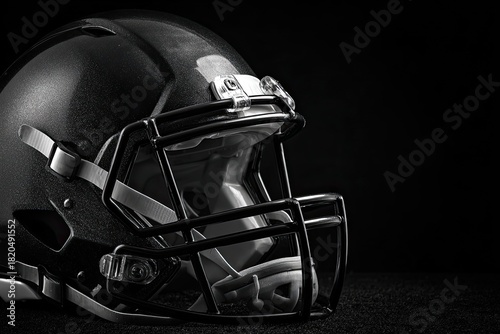 Fototapeta premium A shadowed, close-up shot of a black football helmet, showcasing its detail