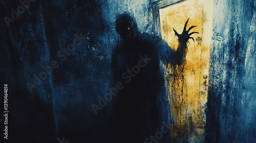 © Tabinda, Obraz premium A shadowy, ghostly figure with glowing eyes and clawed hands emerges from a brightly lit doorway.