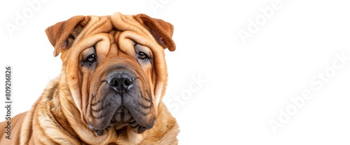 © GenVision, Obraz premium A Shar Pei Dog Poses Against A Crisp White Background, Showcasing Its Distinctive Features, Background