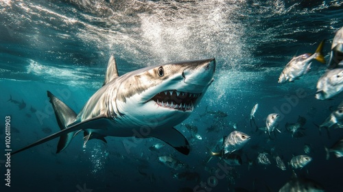 Naklejka premium A shark captured mid-hunt, chasing a group of smaller fish in the open sea,...