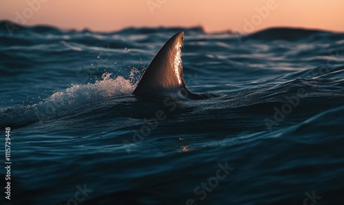 Fototapeta premium A shark fin emerges from the ocean at sunset, capturing nature's beauty.