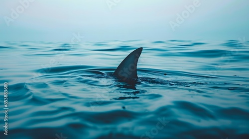 Fototapeta premium A shark fin is seen above the water surface, a sense of danger and fear in an ocean setting.