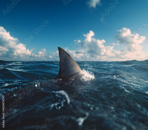 Fototapeta premium A shark fin rises above the tranquil ocean surface, with blue skies and...