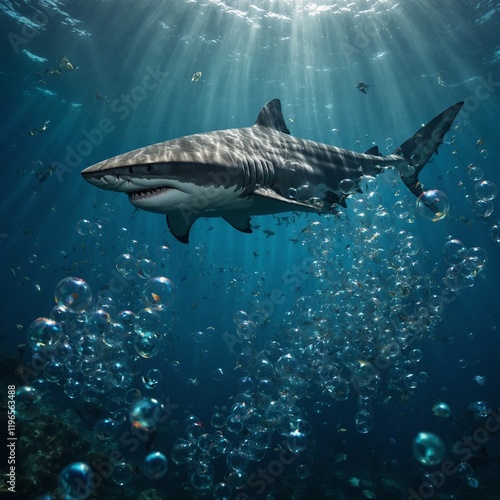 Naklejka premium A shark surrounded by sparkling bubbles, as if in a dreamlike underwater...