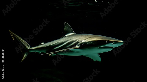 Fototapeta premium A shark swimming in dark water, illuminated from the side, showing its sleek...