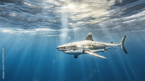Fototapeta premium A shark swimming just beneath the ocean surface, its streamlined body cutting through the water with remarkable speed and agility, set against a clear blue ocean.