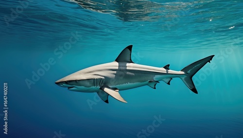 Fototapeta premium A shark swimming underwater with a blue ocean background.