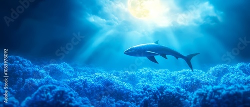 Fototapeta premium A shark swims above a coral reef during a full moon