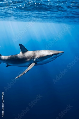Naklejka premium A shark swims gracefully through the deep blue ocean, illuminated by a shaft of sunlight penetrating the water's surface.