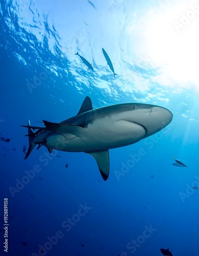 © Manan, Fototapeta premium A shark swims underwater towards the sunlit surface