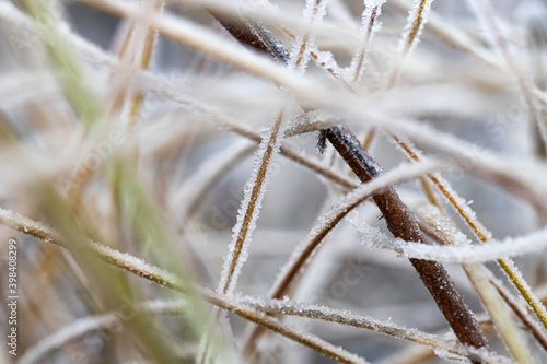 © berkut_34, Fototapeta premium A sharp cold snap covered the meadow with still green grass