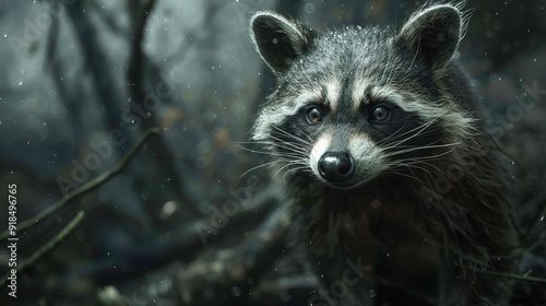 Naklejka premium A sharp focus of a raccoon in a forest peering at the lens with a hazy gaze...