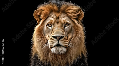 Fototapeta premium A sharp image of a lion's face against a black backdrop, with the eyes...