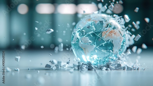 © cloud7days, Obraz premium A shattered glass screen with a distorted globe reflection.