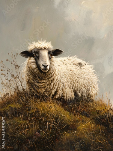 © ckybe, Obraz premium A sheep grazes on the slope of a verdant hill.