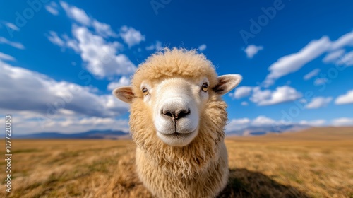 © Albert, Obraz premium A sheep standing in a grassy field with a blue sky in the background