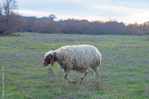© TAMER YILMAZ, Obraz premium A sheep trying to keep up with the flock in the pasture.