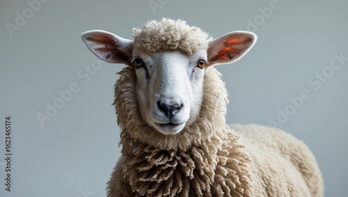 © Lasvu, Fototapeta premium A sheep with fluffy wool and a calm expression, facing the camera against a plain background.