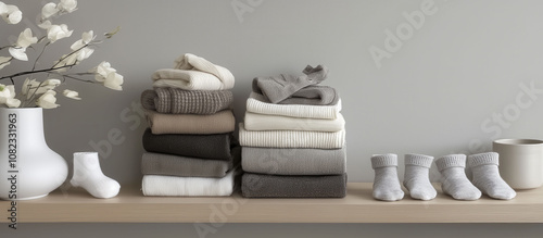 Obraz premium A shelf with a pile of knitted items and a pair of baby socks. The knitted items are of various colors and textures, and the socks are white. Concept of warmth and comfort